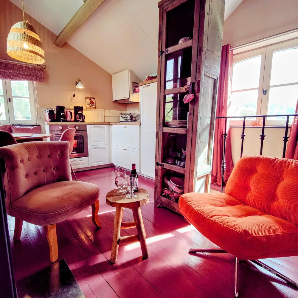 L’intérieur bénéficie d’une grande cuisine, équipée d’un réchaud électrique, four, micro-ondes, cafetière, Senseo, Nespresso, bouiloire electrique, grille-pain, radio/cd, télévision avec Netflix et lecteur dvd. Un insert avec des buches gratuits pour un séjour cosy.