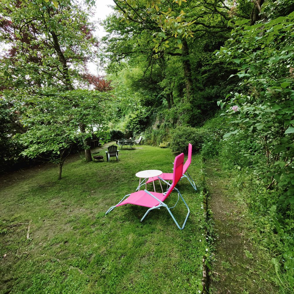 Le cottage est situé contre une colline. La terrasse, soufflant l’atmosphère du jardin aux terrasses anglaises, mises en place derrière, donne sur le château, toujours habité par la comtesse D’Ursel, sur l’Ourthe et le vieux centre-ville dynamique. Par le portail de fer on peut entrer dans le jardin aux terrasses, auparavant partie du château. Plusieurs jardins en terrasses, dont chacun à sa propre vue, marchepieds en pierre et arbres fruitiers, le tout entouré par de forts murs antiques. Logis à un jet de pierre du coeur de la cité pittoresque et malgré cela tout de même tout le calme et liberté pour se détendre.